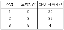 SJF(Shortest Job First) 스케줄링에서 작업 도착 시간과 CPU 사용시간은 다음 표와 같다. 모든 작업들의 평균 대기시간은?