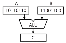 다음 그림과 같이 A, B 레지스터에 있는 2개의 데이터에 대해 ALU에 의한 OR 연산이 이루어졌을 때 그 결과가 출력되는 C 레지스터의 내용은?