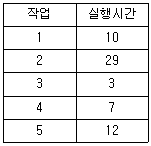 다음 표와 같은 작업부하가 시간 0에 도착했을 경우 SJF 방식으로 스케줄링할 때 평균대기시간은?