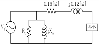 15,000/200[V], 10[kVA]인 변압기의 등가회로는 다음과 같다. 변압기의 출력전압이 정격전압이라 가정하고 0.8 지상역률 정격부하에서 운전되고 있을 때, 전압변동률[%]은? (단, 1차측 권선저항과 누설리액턴스는 무시한다)