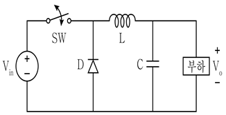 다음 그림의 DC-DC 컨버터 명칭과 정상상태에서의 입출력전압의 관계는? (단, TD는 SW의 duty ratio이다)