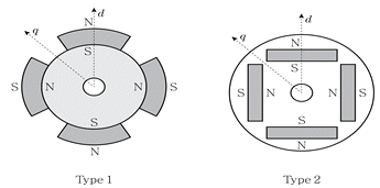그림과 같은 두 가지 회전자 타입의 영구자석 동기전동기에 대한 설명으로 옳지 않은 것은?