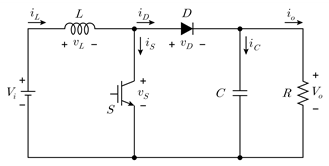 그림과 같은 컨버터회로에서 입력전압 Vi = 100[V]이고 듀티비(duty ratio)가 0.5일 때, 출력전압 Vo[V]는? (단, 모든 소자는 이상적으로 동작하고, 커패시턴스 C와 인덕턴스 L은 충분히 크다고 가정한다)