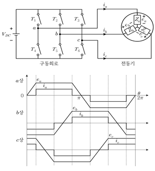 그림과 같은 구동회로와 상 역기전력, 상전류를 갖는 전동기에 대한 설명으로 옳지 않은 것은?