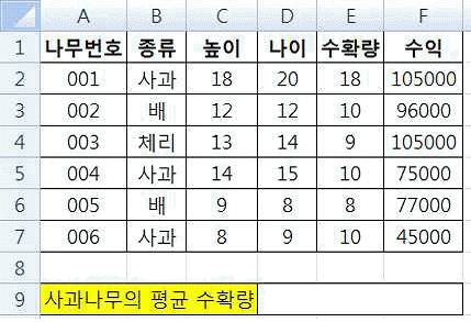 다음 중 [D9] 셀에서 사과나무의 평균 수확량을 구하는 경우 나머지 셋과 다른 결과를 표시하는 수식은?