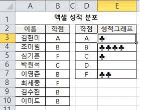 다음 중 학점[B3:B10]을 이용하여 [E3:E7] 영역에 학점별 학생수만큼 '♣' 기호를 표시하고자 할 때, [E3] 셀에 입력해야 할 수식으로 옳은 것은?