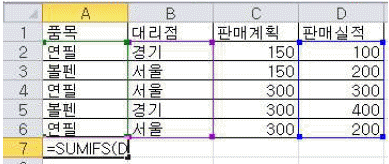 다음 중 [A7] 셀에 수식 ‘=SUMIFS(D2:D6, A2:A6, "연필", B2:B6, "서울")’을 입력한 경우 그 결과 값은?