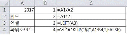 다음 중 아래 워크시트에서 C열의 수식을 실행했을 때 화면에 표시되는 결과로 옳지 않은 것은?