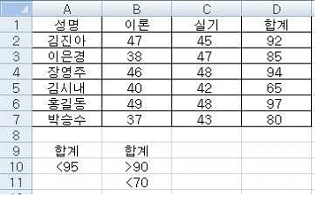 다음 중 아래 그림의 표에서 조건범위로 [A9:B11] 영역을 선택하여 고급필터를 실행한 결과의 레코드 수는 얼마인가?