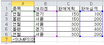 다음 중 [A7] 셀에 수식 '=SUMIFS(D2:D6,A2:A6, "연필", B2:B6, "서울")'을 입력한 경우 결과 값으로 옳은 것은?