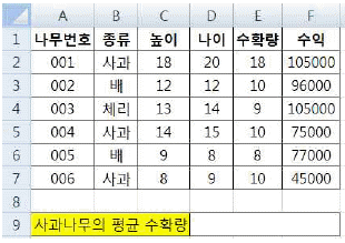 다음 중 [D9] 셀에서 사과나무의 평균 수확량을 구하고자 하는 경우 나머지 셋과 다른 결과를 표시하는 수식은?