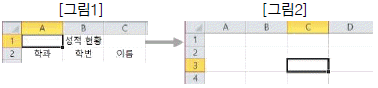 새 워크시트에서 [A1] 셀에 셀 포인터를 두고, [개발도구] 탭의 [상대 참조로 기록]을 선택한 후 [매크로기록]을 클릭하여 [그림1]과 같이 데이터를 입력하는 '매크로1'을 작성하였다. 다음 중 [그림2]와 같이 [C3]셀에 셀 포인터를 두고 '매크로1'을 실행한 경우 '성적현황'이 입력되는 셀의 위치는?
