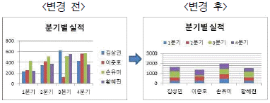 다음 중 <변경 전> 차트를 <변경 후> 차트로 수정하기 위해 적용한 기능으로 옳지 않은 것은?