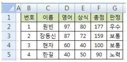다음 중 판정[G2:G5] 영역에 총점이 160 이상이면 '우수', 100 이상 160 미만이면 '보통', 100 미만이면 '노력'으로 입력하려고 할 경우 [G2] 셀에 입력할 수식으로 옳은 것은?