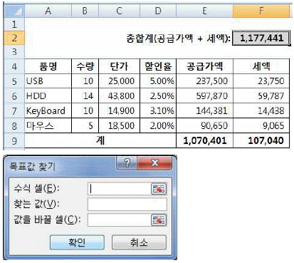 아래 견적서에서 총합계 [F2] 셀을 1,170,000원으로 맞추기 위해서 [D6] 셀의 할인율을 어느 정도로 조정해야 하는지 그 목표값을 찾고자 한다. 다음 중 [목표값 찾기] 대화상자의 각 항목에 들어갈 내용으로 옳은 것은?