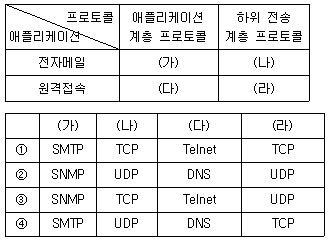 다음 제시된 표에서 (가)~(라)에 들어갈 애플리케이션 계층 프로토콜 및 하위 전송 계층 프로토콜을 바르게 연결한 것은?