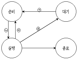 다음은 프로세스 상태 전이도이다. 각 상태 전이에 대한 예로 적절하지 않은 것은?