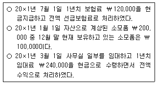 (주)한국은 20×1년 말 결산 중 다음 항목에 대한 기말수정분개가 누락된 것을 발견하였다. 누락된 기말수정분개가 20×1년 당기순이익에 미치는 영향은? (단, 기간은 월할 계산한다.)