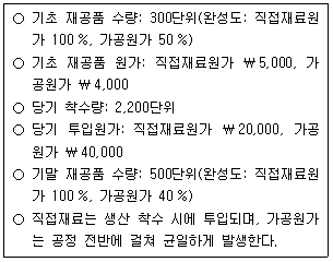 (주)한국은 종합원가계산제도를 채택하고 있으며, 가중평균법을 적용하고 있다. 다음의 자료를 이용한 완성품원가는?