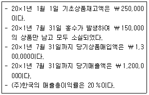 (주)한국의 재고자산과 관련한 자료가 다음과 같을 때, 홍수로 소실된 상품의 추정원가는?