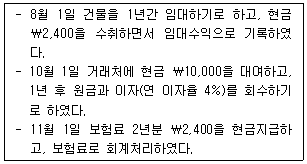 다음은 (주)한국과 관련된 거래이다. 기말 수정분개가 재무제표에 미치는 영향으로 옳은 것은? (단, 기간은 월할 계산한다)