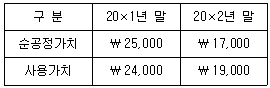 (주)한국은 20×1년 7월 1일 기계장치(정액법 상각, 내용연수 3년, 잔존가치 ₩0)를 ₩36,000에 취득하여 원가모형을 적용하고 있다. 기계장치의 순공정가치와 사용가치는 다음과 같다.