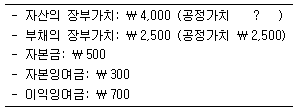 만약, 이 중 75%를 ₩2,000에 취득하고 영업권 ₩500을 인식한다면 (주)민국의 자산 공정가치는?