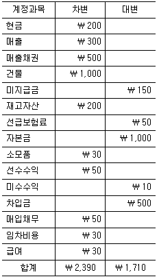 20×1년 초 설립한 (주)한국의 20×1년 말 수정전시산표는 회계기록상 계정잔액의 오류가 없었음에도 불구하고, 차변 합계와 대변 합계가 일치하지 않았다.