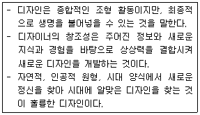 보기에서 공통적으로 설명하는 디자인의 조건은 ?