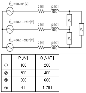 그림의 회로에서 한 상의 부하가 Z△=3+j6[Ω]일 때, 3상 부하 전체의 유효전력 P[W]와 무효전력 Q[VAR]는? (단, 전압은 실횻값이다)