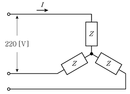 그림의 평형 3상 회로에서 선간전압이 220[V]이고 한 상의 임피던스가 Z=4+j3[Ω]일 때, 선전류 I[A]는? (단, 전압과 전류는 실횻값이다)