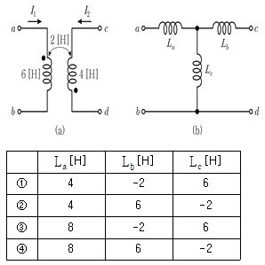 그림 (a)의 선형 변압기를 그림 (b)와 같이 T형 등가회로로 나타내었을 때, La, Lb, Lc의 각 인덕턴스[H]는?