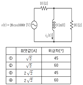 그림의 회로가 정상상태에서 동작할 때, 인덕터에 흐르는 전류 iL(t)의 최댓값[A]과 전압 v(t)와 전류 iL(t)의 위상차[°]는?