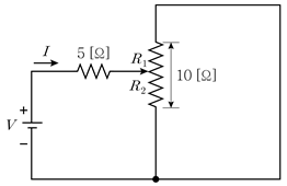그림의 회로에서 전류 I가 최소가 되는 저항 R2[Ω]는? (단, 가변저항에서 화살표는 10[Ω]을 저항 R1과 R2로 분할한다)