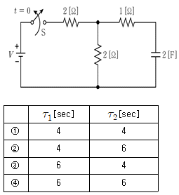 그림의 회로에서 스위치 S는 t=0일 때 개방된다. 스위치 S가 닫혀 있을 때 회로의 시정수 τ1[sec]과 t>0 에서 스위치 S가 개방된 회로의 시정수 τ2[sec]는?