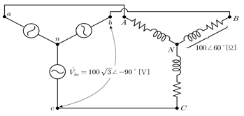 그림의 평형 3상 Y-Y 회로에서 3상 부하가 흡수하는 전체 평균전력[W]은? (단, 전압은 실횻값이다)
