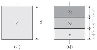 그림 (가)와 같이 면적이 S, 극간 거리가 d인 평행 평판 커패시터가 있고, 이 커패시터의 극판 내부는 유전율 ε인 물질로 채워져 있다. 그림 (나)와 같이 면적이 S인 평행 평판 커패시터의 극판 사이에 극간 거리 d의 1/3 부분은 유전율 3ε인 물질로 극간 거리 d의 1/3 부분은 유전율 2ε인 물질로 그리고 극간 거리 d의 1/3 부분은 유전율 ε인 물질로 채웠다면, 그림 (나)의 커패시터 전체 정전용량은 그림 (가)의 커패시터 정전용량의 몇 배인가? (단, 가장자리 효과는 무시한다)