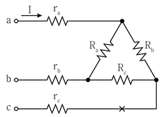 표시된 지점이 단선되었다. 단자 a와 단자 b 사이에 인가되는 전압이 120[V]일 때, 저항 ra에 흐르는 전류 I[A]는? (단, Ra=Rb=Rc=3[Ω], ra=rb=rc=1[Ω]이다)