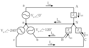 그림의 평형 3상 Y-Y 결선에 대한 설명으로 옳지 않은 것은?