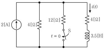 그림의 회로에서 스위치 S가 충분히 오랜 시간 동안 개방되었다가 t=0[s]인 순간에 닫혔다. t >0 일 때의 전류 i(t)[A]는?