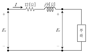 다음 회로는 뒤진 역률이 0.8인 300 [kW]의 부하가 걸려있는 송전선로이다. 수전단 전압 Er=5,000 [V]일 때, 전류 I [A]와 송전단 전압 Es [V]는? (순서대로 I[A], Es[V])