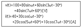 부하에 인가되는 비정현파 전압 및 전류가 다음과 같을 때, 부하에서 소비되는 평균전력[W]은?