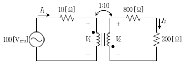 다음 그림과 같은 이상적인 변압기 회로에서 200 [Ω] 저항의 소비전력[W]은?