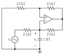 이상인 연산 증폭기를 포함한 그림의 회로에서 vs(t)=cost[V]일 때, 커패시터 양단 전압 vc(t)[V]는? (단, 커패시터의 초기전압은 0[V]이다.)