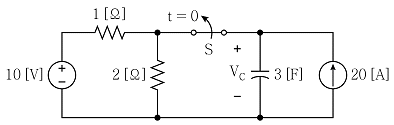 그림의 회로에서 스위치 S가 충분히 긴 시간 동안 닫혀있다가 t=0에서 개방된 직후의 커패시터 전압 VC(0+)[V]는?