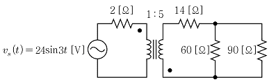 이상적인 변압기를 포함한 그림의 회로에서 정현파 전압원이 공급하는 평균 전력[W]은?
