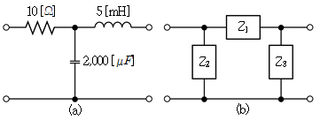 그림 (a)의 T형 회로를 그림 (b)의 π형 등가회로로 변환할 때, Z3[Ω]은? (단, ω=103[rad/s]이다)