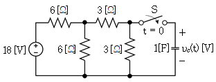 그림의 회로에서 t=0[sec]일 때, 스위치 S를 닫았다. t=3[sec]일 때, 커패시터 양단 전압 vc(t)[V]은? (단, vc(t=0-)=0[V]이다)