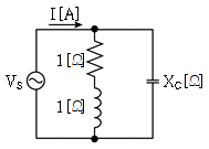 그림의 회로에서 교류전압을 인가하여 전류 I[A]가 최소가 될 때, 리액턴스 XC[Ω]는?