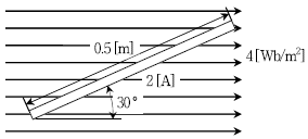 자속밀도 4[Wb/m2]의 평등자장 안에서 자속과 30° 기울어진 길이 0.5[m]의 도체에 전류 2[A]를 흘릴 때, 도체에 작용하는 힘 F[N]는?